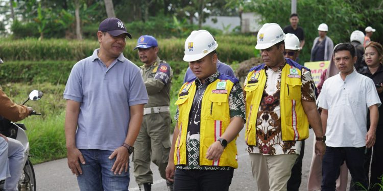 Bojong – Mendukung kesiapan arus mudik Lebaran 2025, Bupati Tegal Ischak Maulana Rohman bersama wakilnya Ahmad Kholid meninjau sejumlah pekerjaan infrastruktur, salah satunya perbaikan ruas jalan Karangjambu-Bojong di Desa Buniwah, Kecamatan Bojong yang sedang dalam tahap pengerjaan, Jumat (14/03/2025). Ruas ini merupakan akses jalur pariwisata menuju Guci sekaligus juga jalur alternatif mudik ke Moga Pemalang dan Brebes.