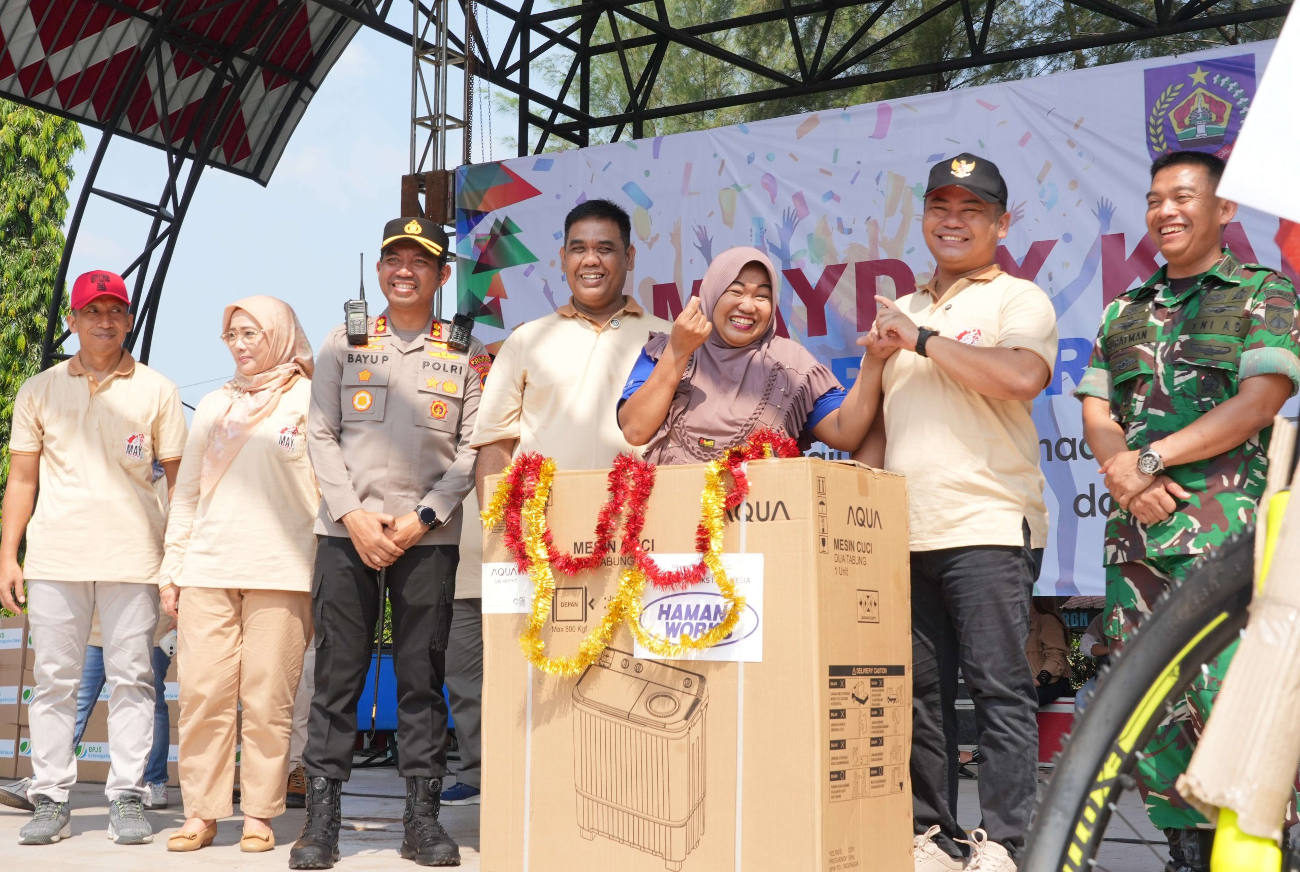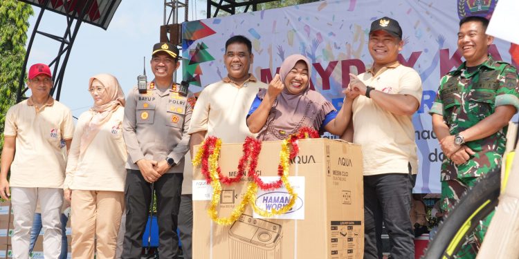Slawi – Peringatan Hari Buruh Internasional atau May Day yang digelar di Taman Rakyat Slawi Ayu (Trasa), Kamis (01/05/2025) pagi berlangsung meriah. Ribuan peserta buruh dari sejumlah wilayah di Kabupaten Tegal tampak memadati lokasi acara yang dimulai dengan senam aerobik dilanjutkan acara hiburan seperti penampilan finalis lomba karaoke dan pembagian doorprize.