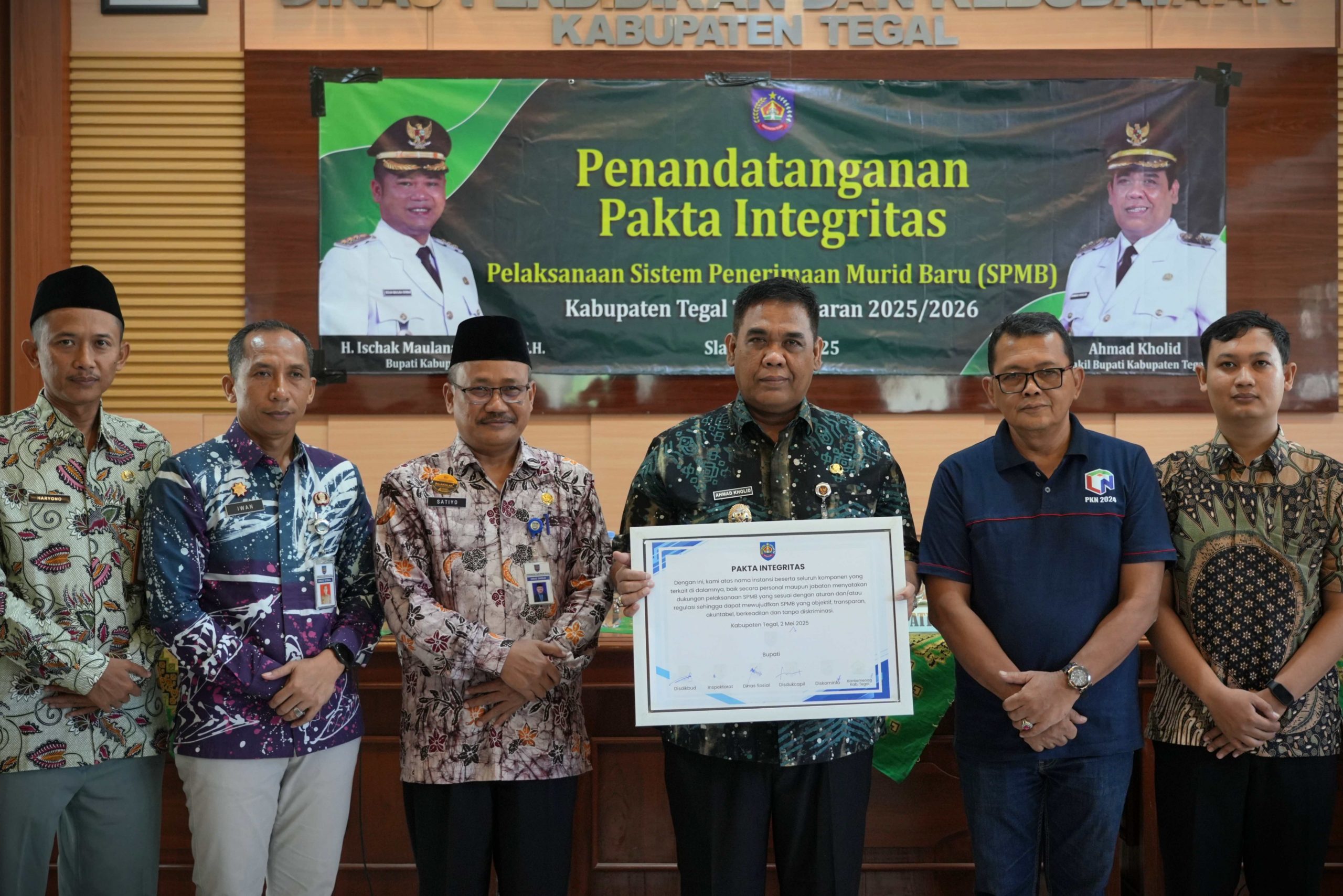 Slawi – Wakil Bupati Tegal Ahmad Kholid didampingi Plt Kepala Dinas Pendidikan dan Kebudayaan (Dikbud) Kabupaten Tegal Satiyo dan sejumlah pejabat lainnya dari Kantor Kementerian Agama Kabupaten Tegal, Dinas Disdukcapil, Dinas Sosial dan Inspektorat menandatangani Pakta Integritas Sistem Penerimaan Murid Baru (SPMB) Tahun Ajaran 2025/2026 di Aula Dinas Dikbud, Jumat (02/05/2025).
