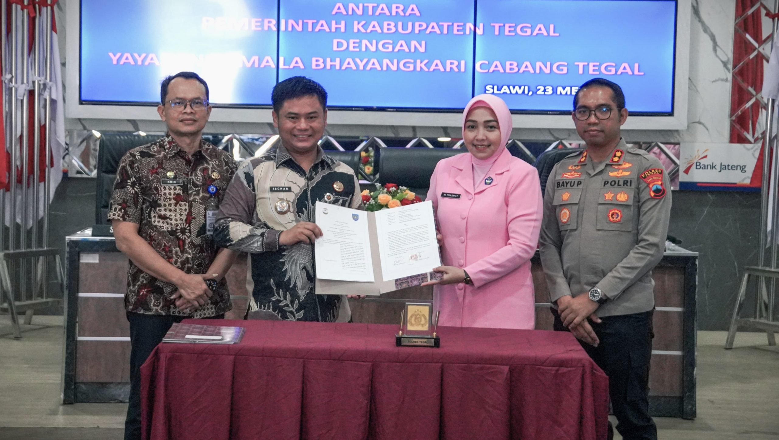 Slawi – Pemerintah Kabupaten Tegal resmi menjalin kerja sama dengan Yayasan Kemala Bhayangkari Cabang Tegal melalui penandatanganan naskah kesepakatan bersama yang dilaksanakan di Gedung Sudhirajati Mapolres Tegal, Jumat(23/05/2025).