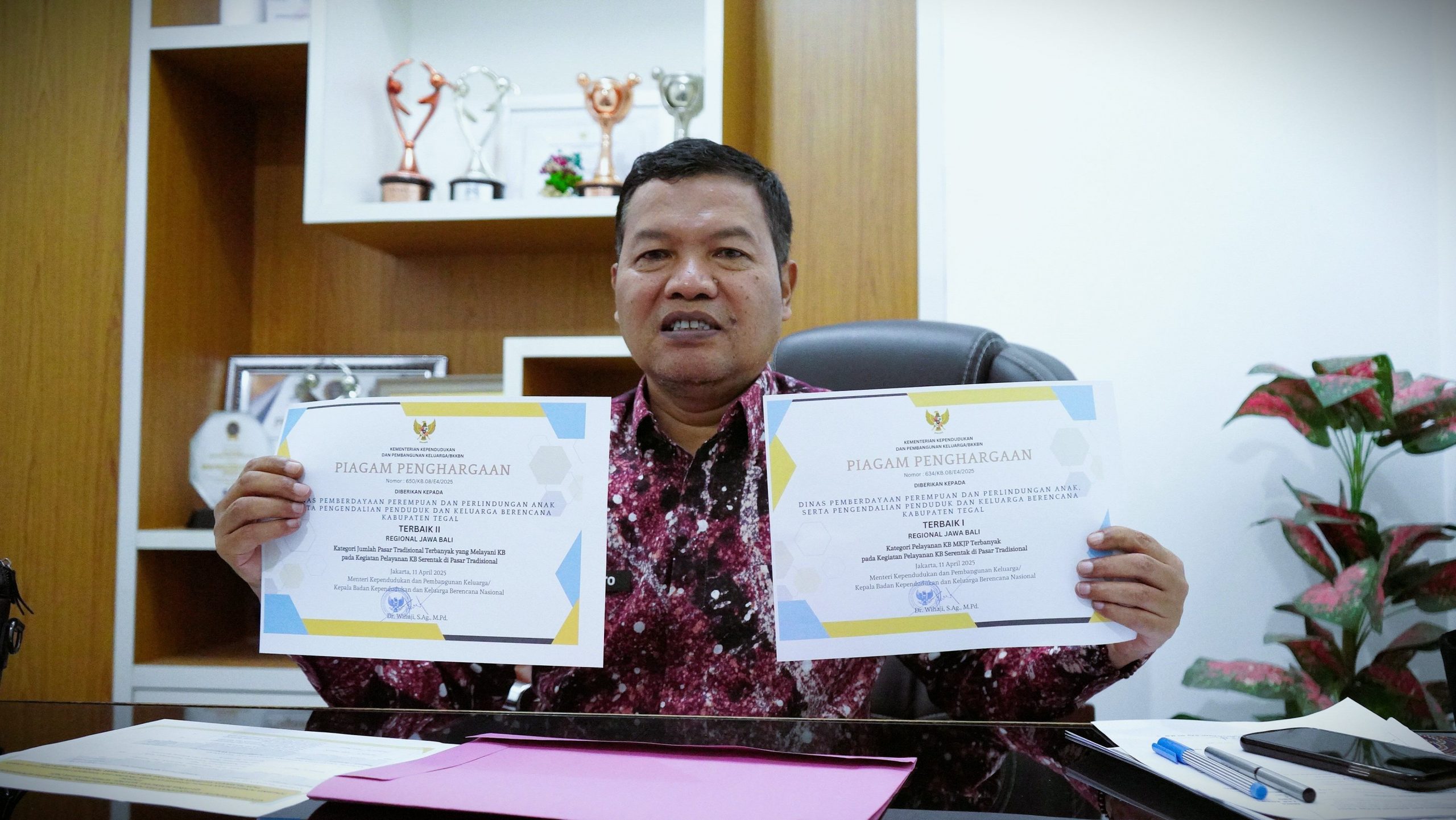 Plt Kepala Dinas DP3AP2KB Kabupaten Tegal Winarto menunjukkan piagam penghargaan bidang KB di ruang kerjanya, Selasa (27/05/2025).