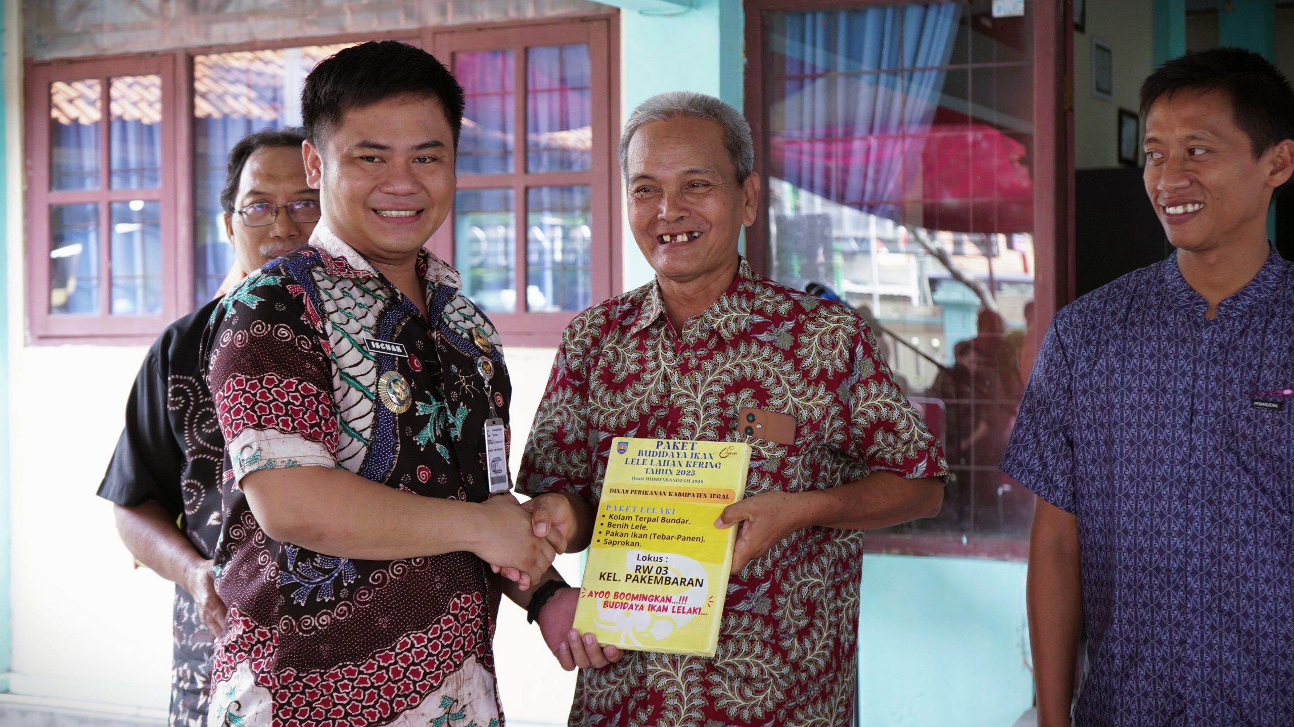 Bupati Tegal Ischak Maulana Rohman membagikan enam paket Lelaki untuk dibudidayakan peternak ikan di darat. Penyerahan simboli berlangsung di halaman kantor Dinas Perikanan Kabupaten Tegal, Rabu (27/05/2025).
