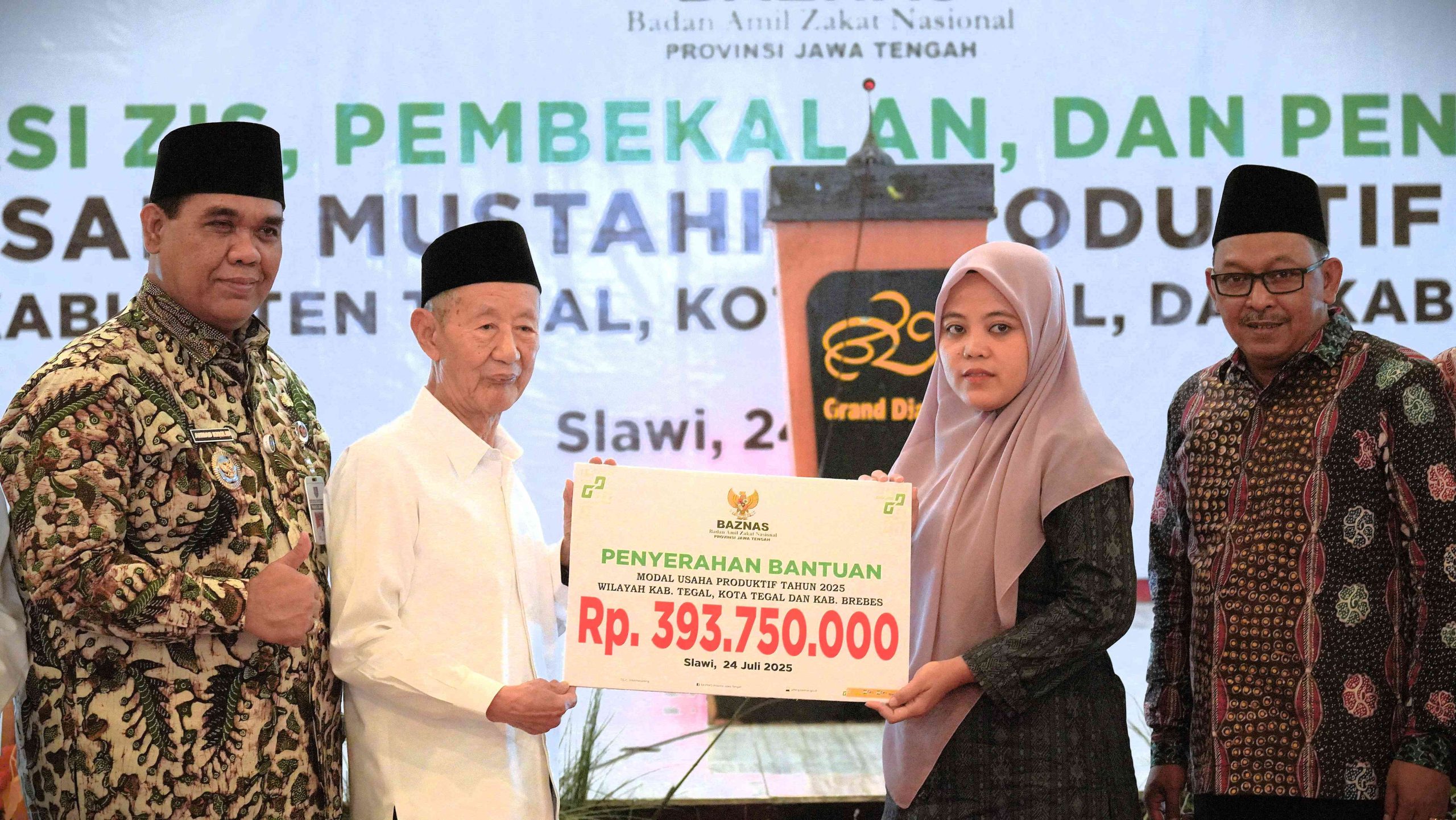 Slawi – Badan Amil Zakat Nasional (Baznas) Provinsi Jawa Tengah menyalurkan bantuan modal usaha produktif tahun 2025 kepada 125 orang mustahik atau orang yang berhak menerima zakat di wilayah Kabupaten Tegal, Kota Tegal, dan Kabupaten Brebes senilai Rp393,75 juta. Mereka adalah pelaku usaha mikro dan kecil atau UMKM.