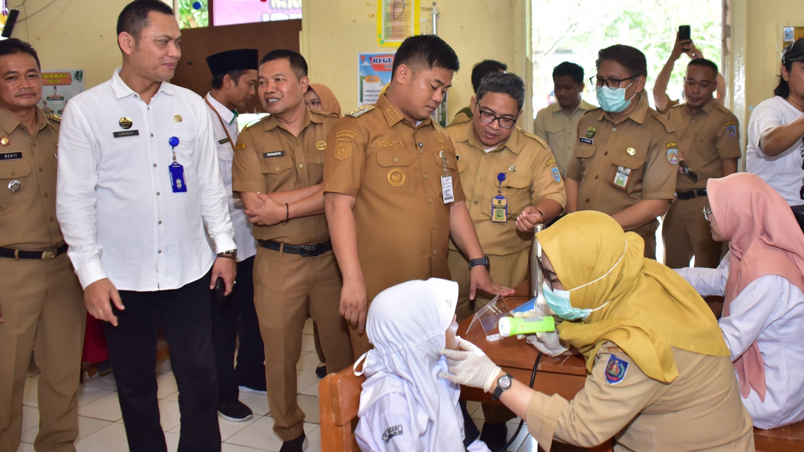 Bupati Tegal Ischak Maulana Rohman saat meninjau pemeriksaan kesehatan pelajar di SD Negeri Slawi Kulon 03, Senin (04/08/2025).