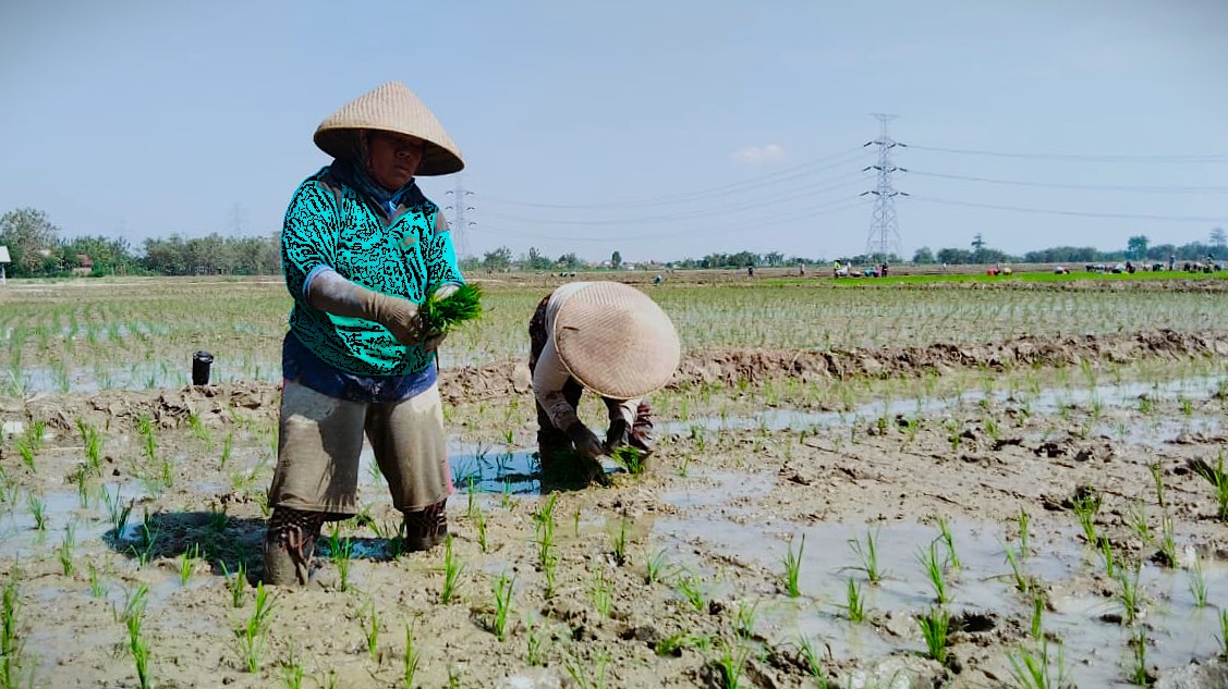 Petani Poktan Maju Makmur di Desa Kedungjati, Kecamatan Warureja saat menanam padi serentak pada Kamis (04/09/2025).