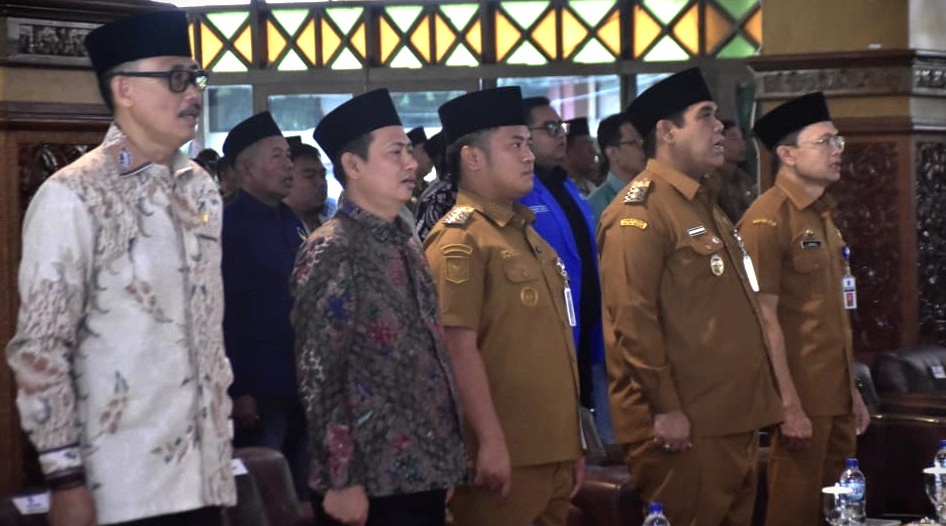 Bupati Tegal Ischak Maulana Rohman (tengah) bersama unsur pimpinan DPRD Kabupaten Tegal saat acara Deklarasi Damai di Pendopo Amangkurat, Senin (08/09/2025).