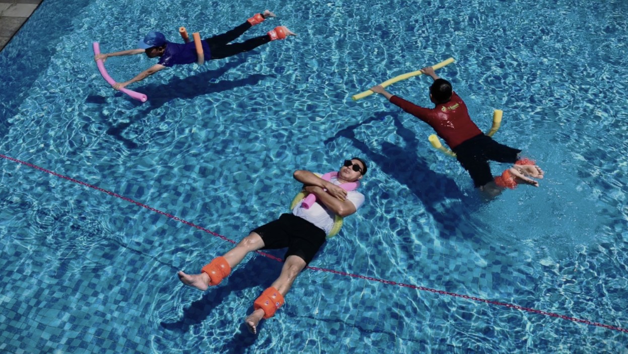 Water trappen, salah satu gerakan mengambang di atas air menggunakan pelampung pada aktivitas wisata hidroterapi di kolam renang salah satu hotel di objek wisata pemandian air panas Guci.