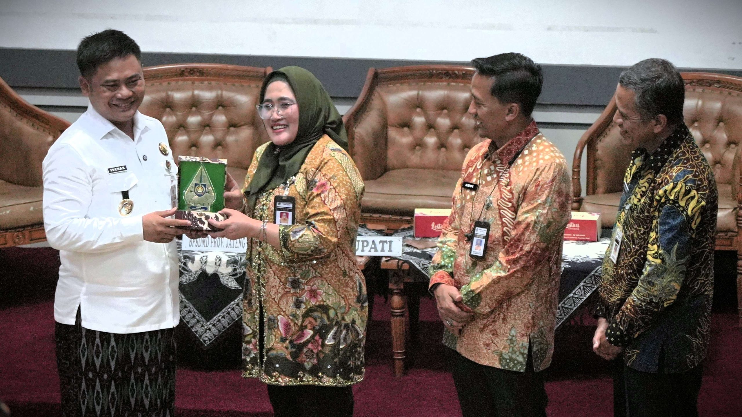 Bupati Tegal Ischak Maulana Rohman (paling kiri) saat bertukar cindera mata dengan ketua rombongan peserta Studi Lapangan Pelatihan Kepemimpinan Administrator (PKA) Angkatan VII Pemerintah Provinsi Jawa Tengah di Gedung Dadali, Senin (23/09/2025).