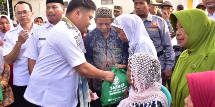 Bupati Tegal Ischak Maulana Rohman menyalurkan bantuan sembako dari Baznas Kabupaten Tegal pada acara Bupati Tilik Desa di Desa Gumalar, Kecamatan Adiwerna, Rabu (24/09/2025).