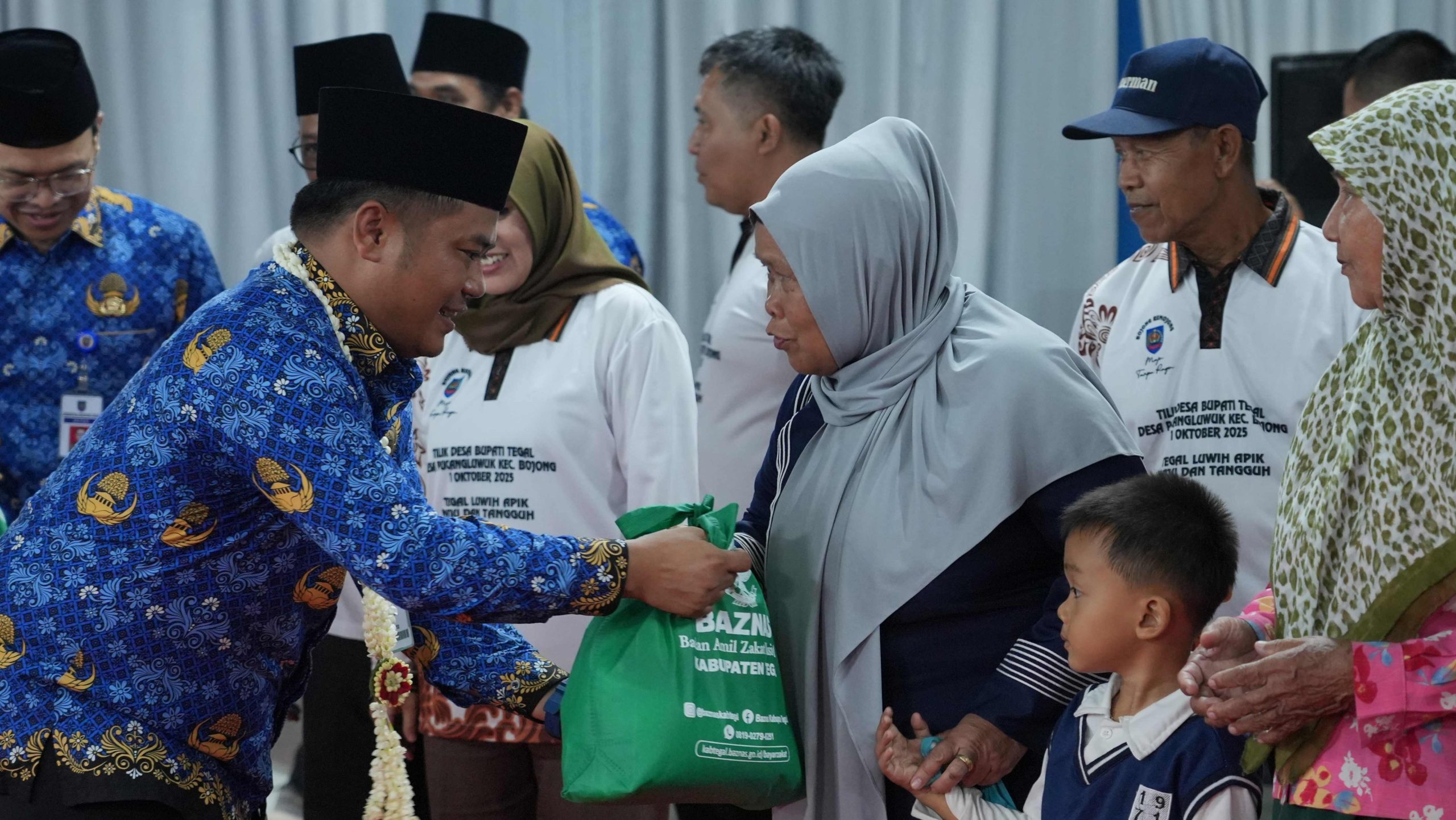 Bupati Tegal Ischak Maulana Rohman menyalurkan paket bantuan Baznas Kabupaten Tegal pada acara acara Bupati Tilik Desa Pucang Luwuk, Kecamatan Bojong, Rabu (02/10/2025).