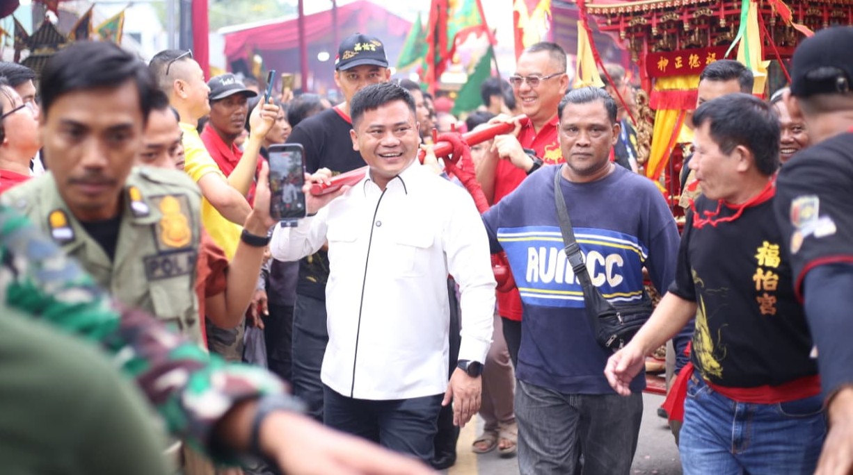 Orang nomor satu di Kabupaten Tegal ini juga ikut mengangkat tandu dewa tuan rumah Klenteng Hok Ie Kiong Slawi Dewa Kongco Hok Tek Ceng Sin atau dewa bumi yang dimaknai sebagai dewa pembawa keberkahan, keberuntungan, dan rezeki.