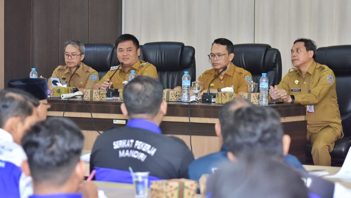 Slawi – Bupati Tegal Ischak Maulana Rohman menerima audiensi Pimpinan Unit Kerja Serikat Pekerja Seluruh Indonesia (PUK SPSI) bersama Koalisi Serikat Pekerja Tegal di Ruang Rapat Bupati Tegal, Senin (15/12/2025). Audiensi tersebut membahas aspirasi pekerja terkait penetapan Upah Minimum Kabupaten (UMK) dan Upah Minimum Sektoral Kabupaten/Kota (UMSK) Tahun 2026.