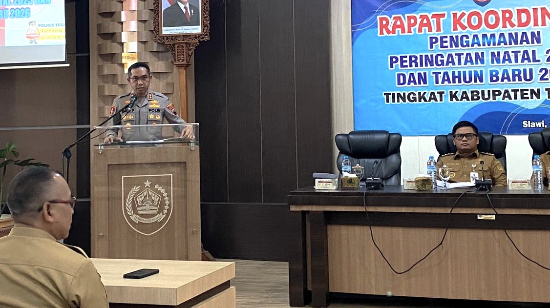 Slawi – Guna memastikan kesiapan seluruh pemangku kepentingan dalam menjaga keamanan, ketertiban, serta kelancaran pelayanan publik selama masa libur Natal 2025 dan Tahun Baru 2026 (Nataru), Pemerintah Kabupaten Tegal bersama jajaran Forkopimda Kabupaten Tegal menggelar Rapat Koordinasi Pengamanan Peringatan Nataru di Ruang Rapat Bupati Tegal, Selasa (16/12/2025).