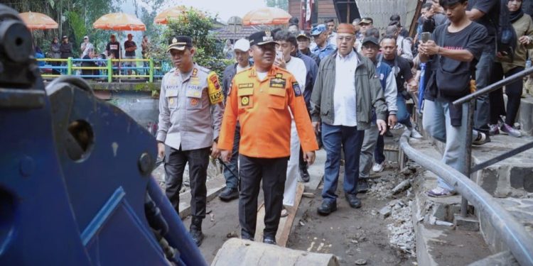 Bumijawa – Bupati Tegal Ischak Maulana Rohman kembali meninjau Taman Wisata Alam (TWA) Pancuran 13 milik BKSDA Jawa Tengah hari Minggu (21/12/2025) siang yang kondisinya rusak karena tertimbun material banjir bandang Kali Gung yang terjadi pada Sabtu (20/12/2025) sore kemarin.