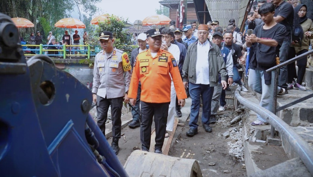 Bumijawa – Bupati Tegal Ischak Maulana Rohman kembali meninjau Taman Wisata Alam (TWA) Pancuran 13 milik BKSDA Jawa Tengah hari Minggu (21/12/2025) siang yang kondisinya rusak karena tertimbun material banjir bandang Kali Gung yang terjadi pada Sabtu (20/12/2025) sore kemarin.