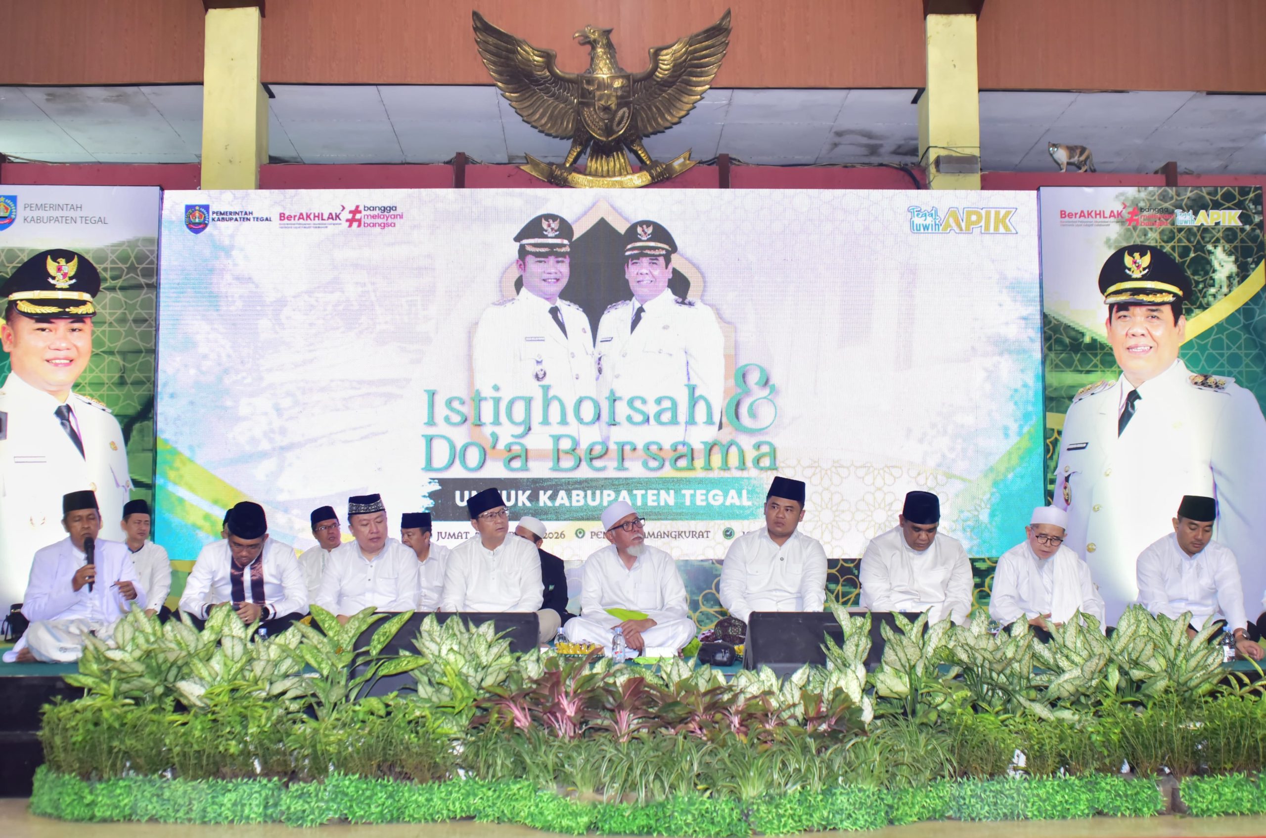 Slawi – Pemerintah Kabupaten Tegal menyelenggarakan kegiatan Istighotsah dan Doa Bersama yang dirangkaikan dengan Refleksi Satu Tahun Kepemimpinan Bupati dan Wakil Bupati Tegal, di Pendopo Amangkurat, Jumat (20/02/2026) malam.